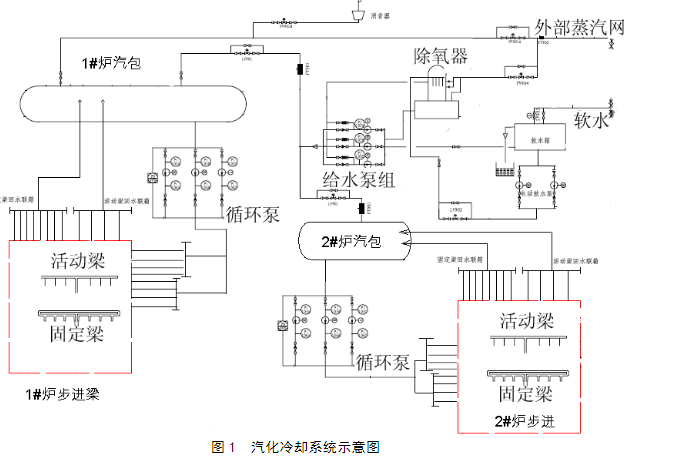加熱爐汽化冷卻系統用于爐內步進梁冷卻,防止步進梁高溫下變形、損壞,同時將冷卻水變成蒸汽部分分離出去。過程是:軟水進入除氧器進行除氧后(將軟水中氧進一步減少)由給水泵注入汽包,汽包中的軟水由循環泵打入步進梁內,一部分軟水變成蒸汽后以飽和蒸汽的形式收集,輸送至外部使用,另一部分軟水或蒸汽繼續參與步進梁冷卻。